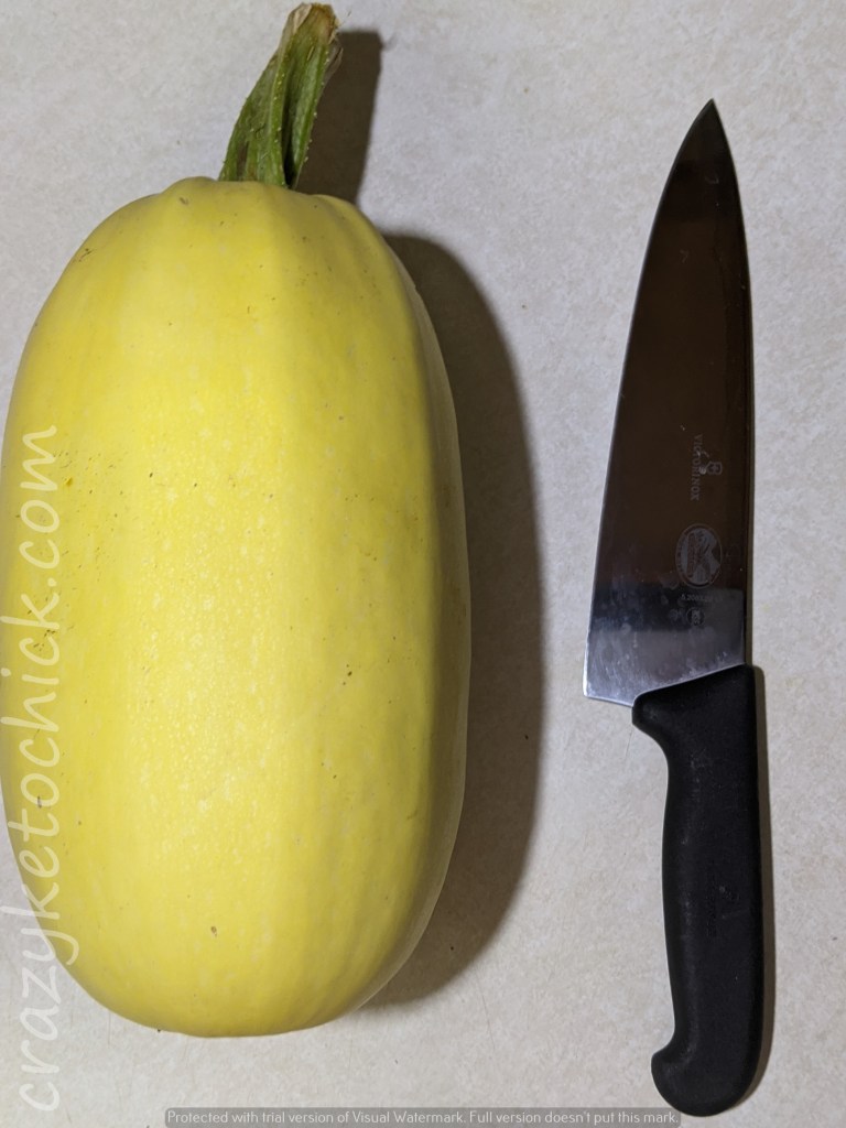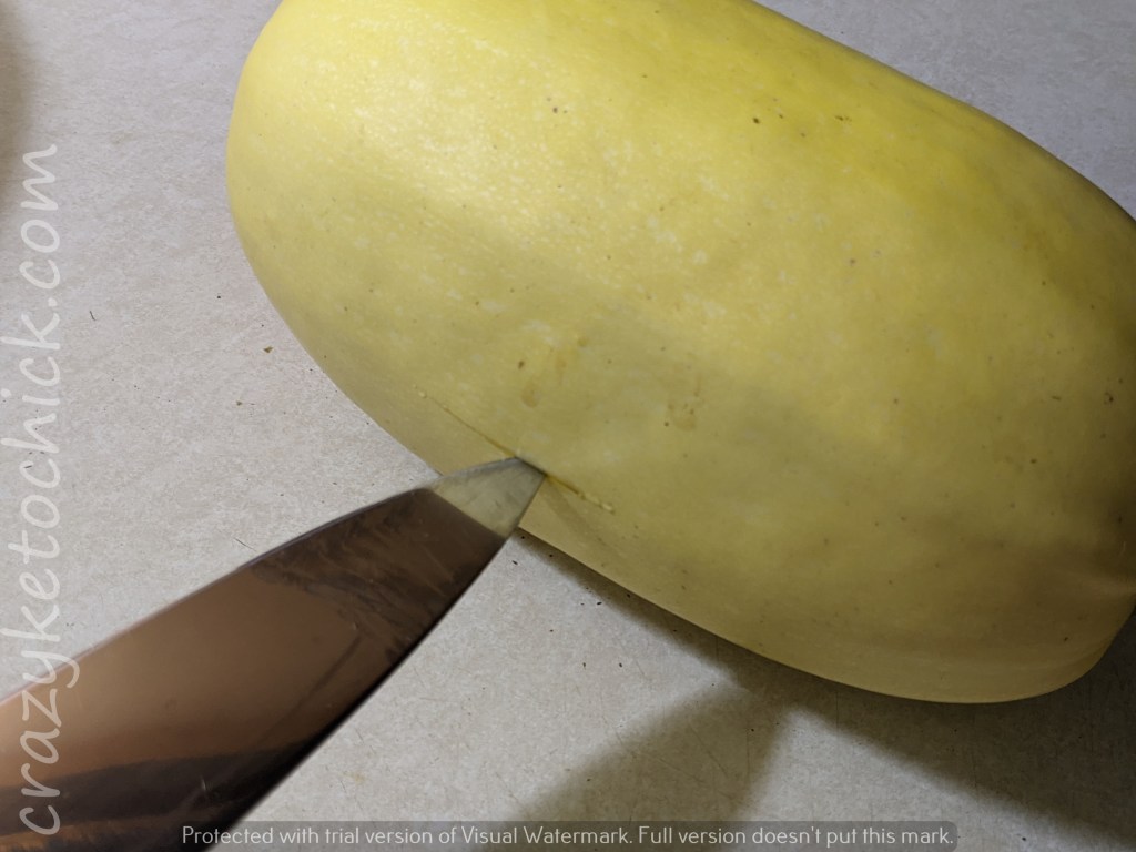 Step 2. When cool, cut the spaghetti squash in half along the longer side of the gourd. Be careful with your knife as the rind of the spaghetti squash is tough. If not making any head way, microwave for a few more minutes.