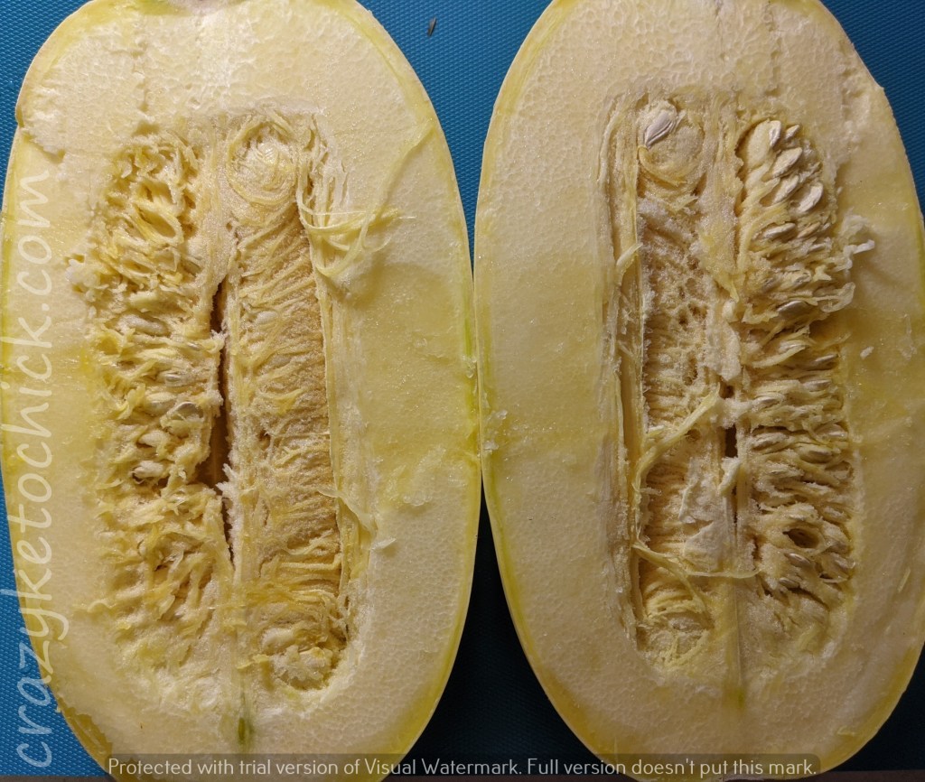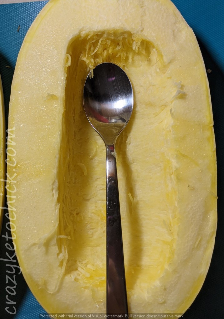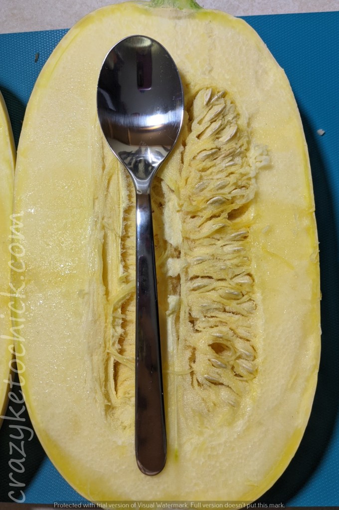 Step 3. Using a spoon, remove the seeds from the inside of the spaghetti squash.