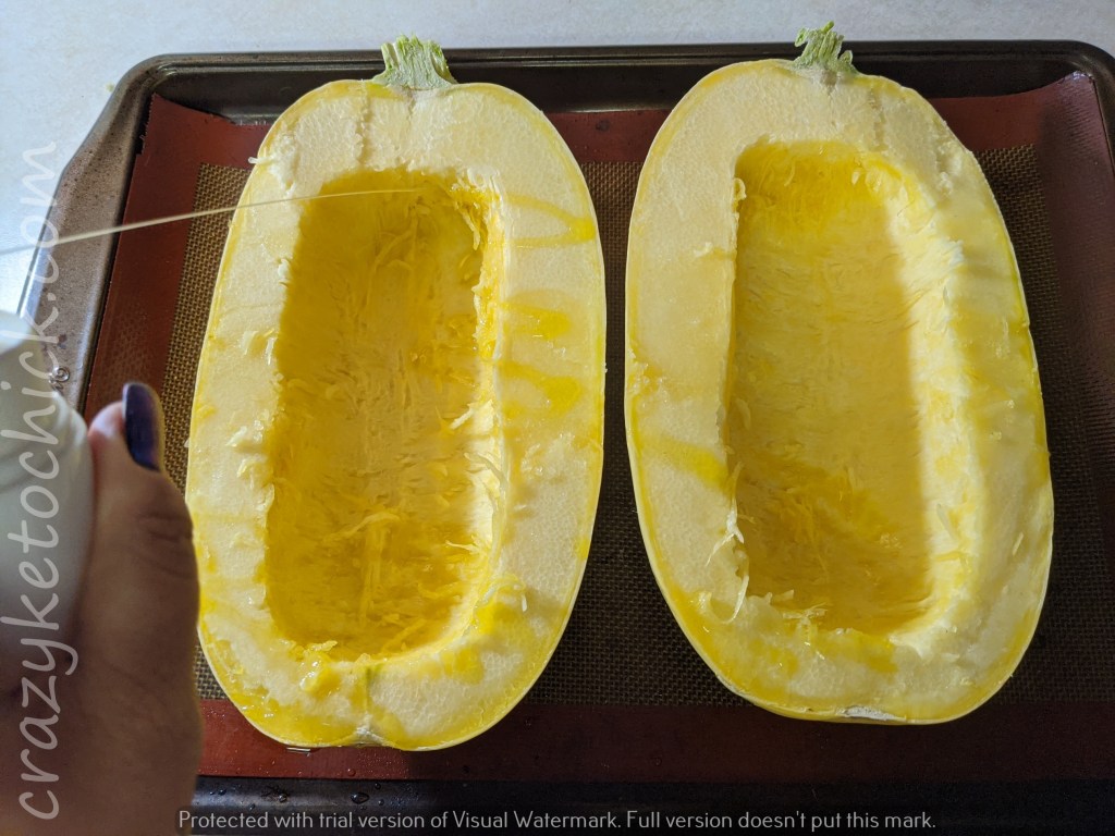 Step 4. Generously coat the inside of the spaghetti squash with oil. Doesn’t matter what kind. Palm oil is usually never good, but other then that, I’m not the boss of you.