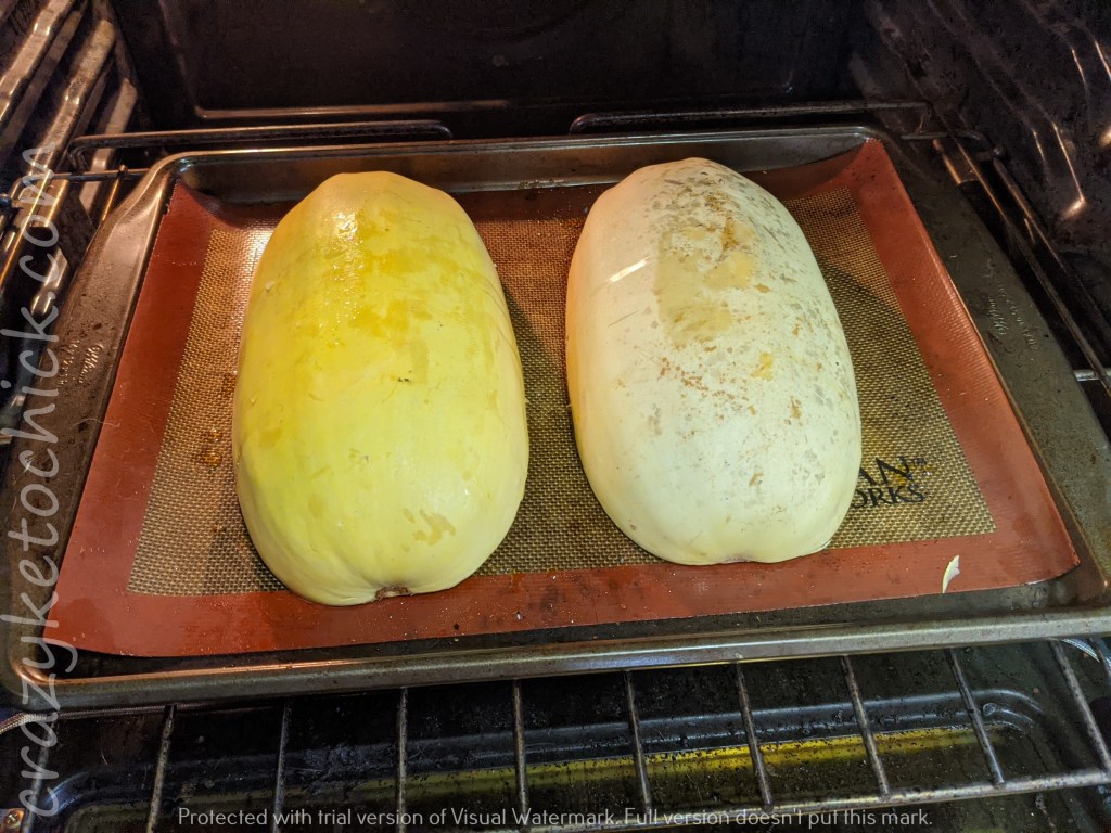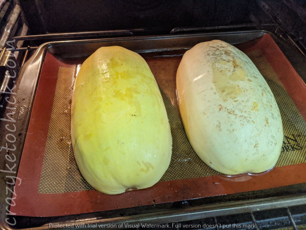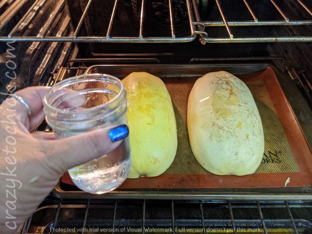 Step 5. Place the spaghetti squash face down on a cookie sheet. Put cookie sheet in the oven that should be preheated by now to 425F. Add about a cup of water to the cookie sheet, otherwise I find the edges to over cook a little bit and dry out.