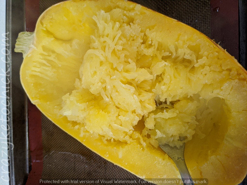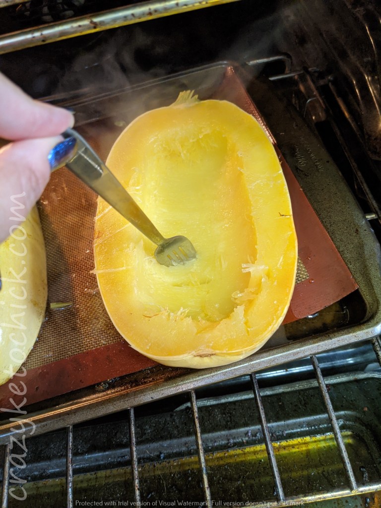 Step 6. Cook your spaghetti squash for about 30 minutes. To test if it is done, use a fork to gently flip the squash over. If you can easily stick your fork into the squash innards, then your done! Remove the squash from the oven, and using your fork, loosen the inside of the squash. The insides will look like spaghetti! You can now add whatever toppings you see fit to your “spaghetti”!