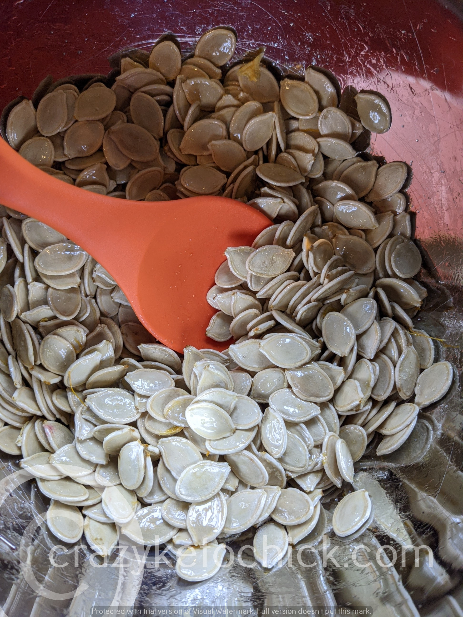 Step 3: Preheat over 400F. Place your seeds in a bowl; coat in a little oil and salt. You want the seeds all lightly coated. If in doubt, use less salt. This crazy chick has learned a little salt goes a LONG way. For about 2 cups of seeds, you will want about a tablespoon of salt and two tablespoons of olive oil.