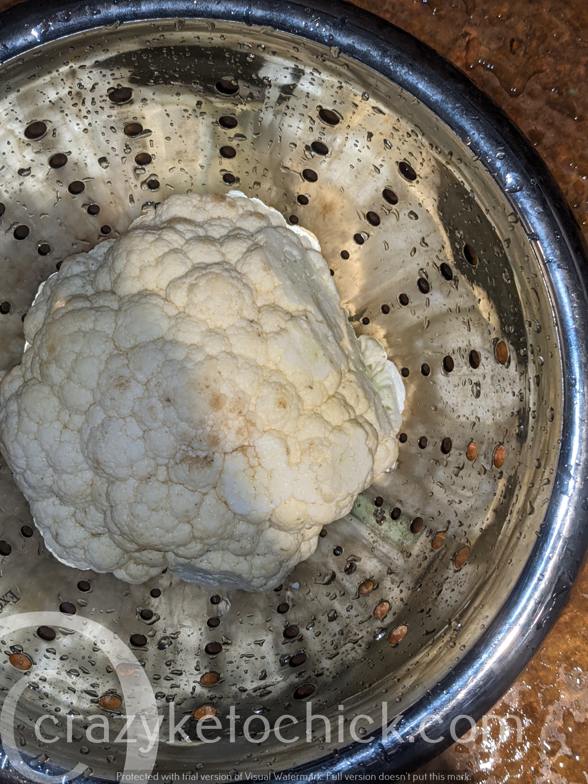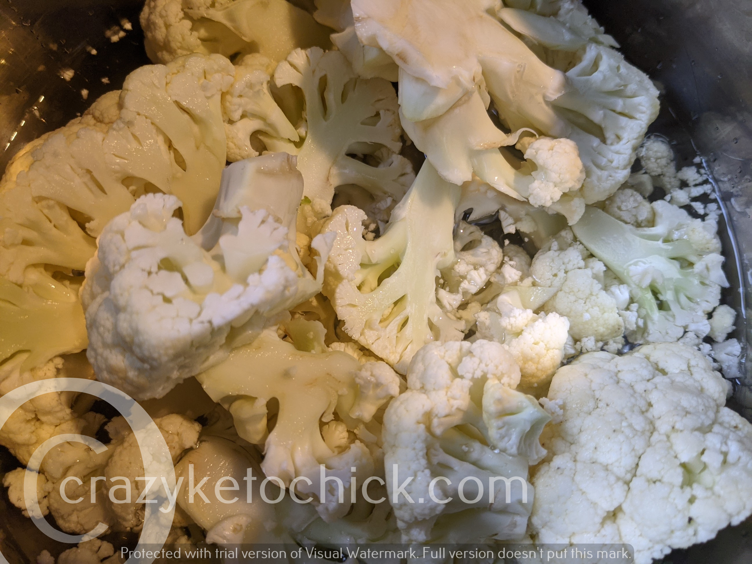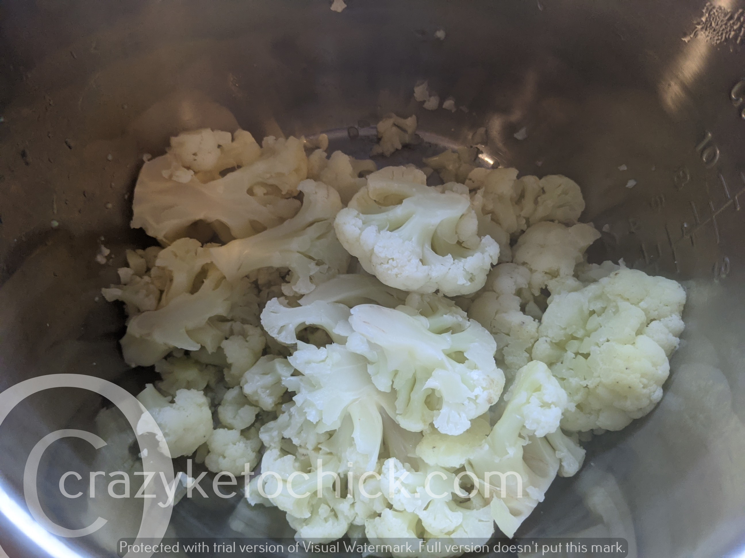 • Step 1: Wash and cut your cauliflower into large pieces. Toss inside your instant pot, along with a little bit of water, per your instant pot directions. (Usually just an inch or two of water). Pressure cook for about 6 minutes.
