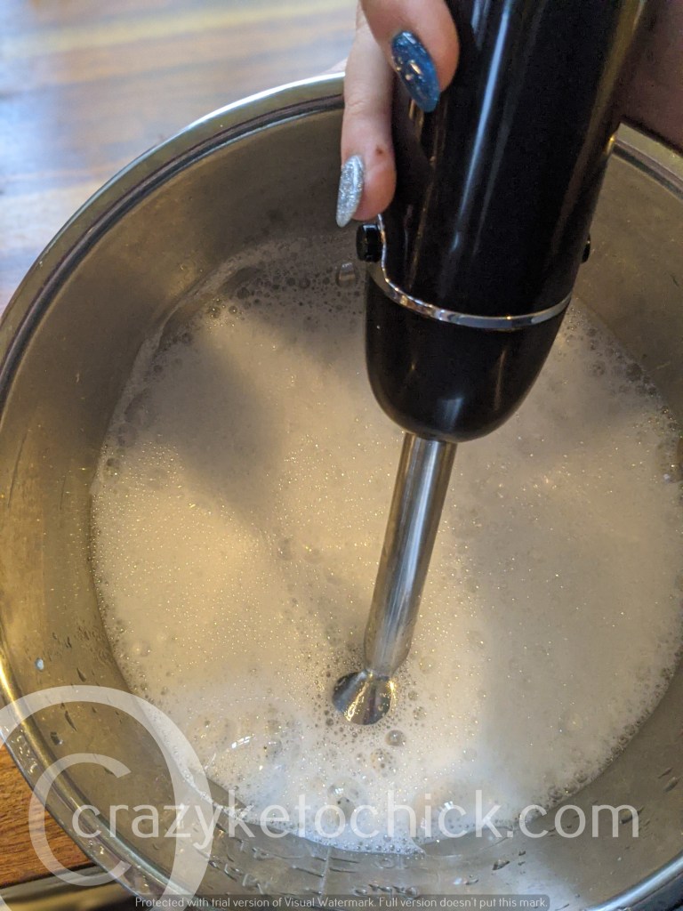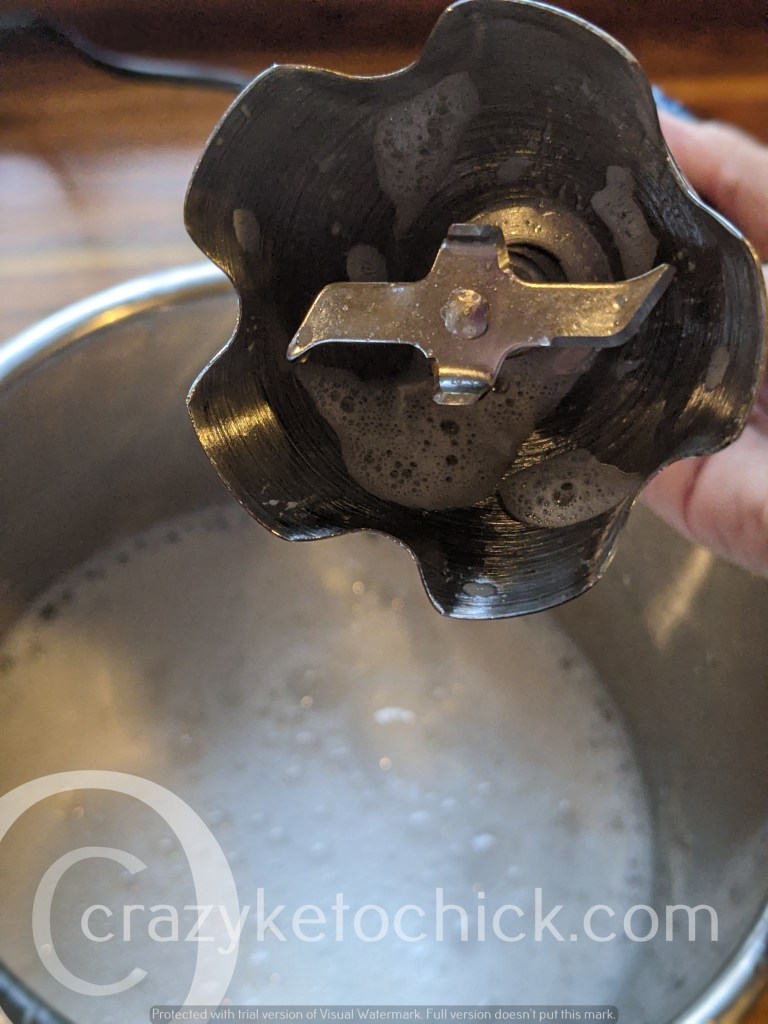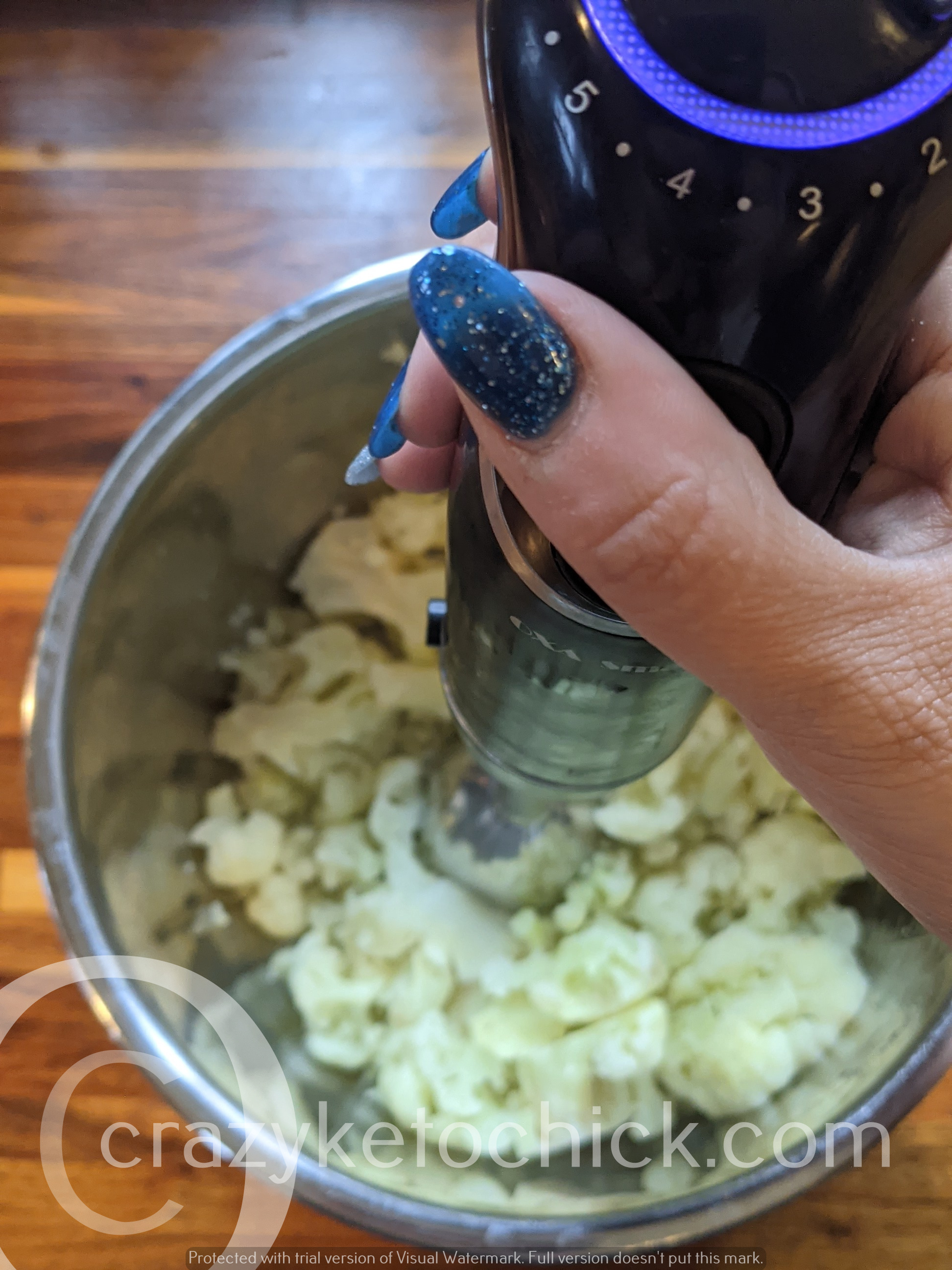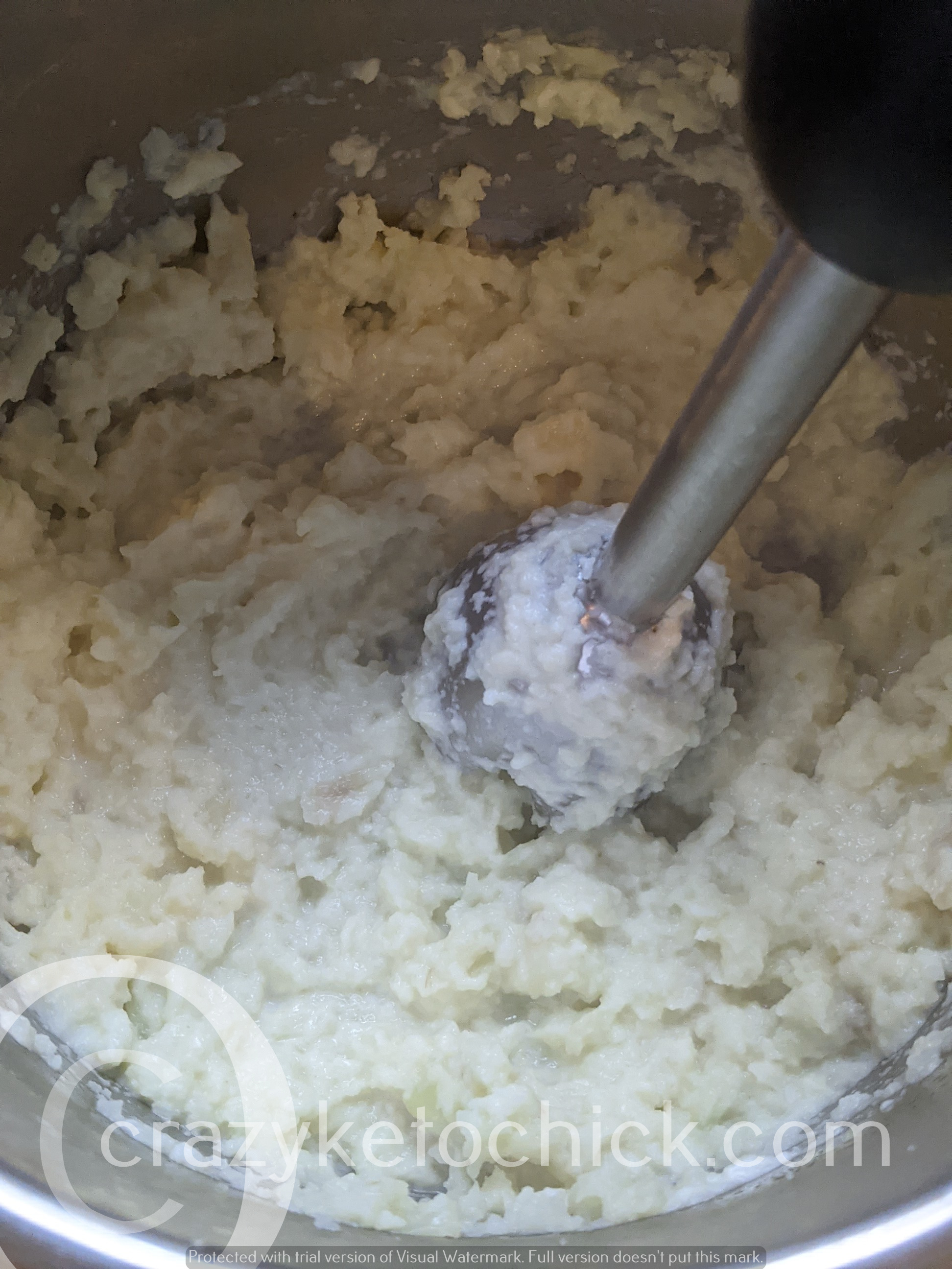 • Step 3: Add approx. 1 ounce of heavy whipping cream. Use you immersion blender to blend the heavy whipping cream and cauliflower together. Season to taste with salt.